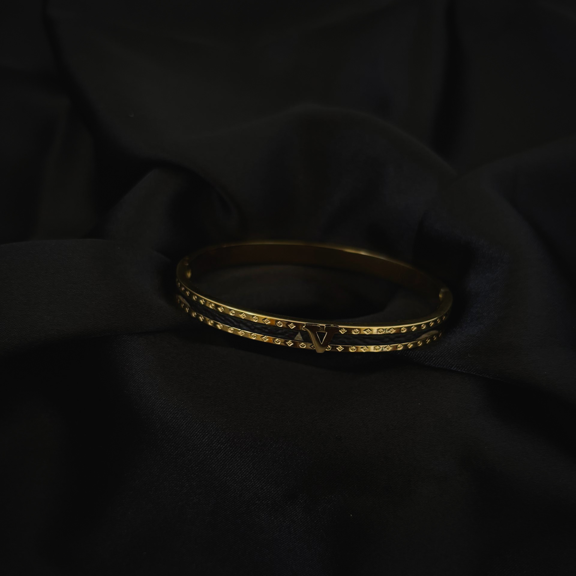 Le bracelet cerceau or avec cuir noir et médaillon V en acier inoxydable allie élégance et caractère dans un design unique.