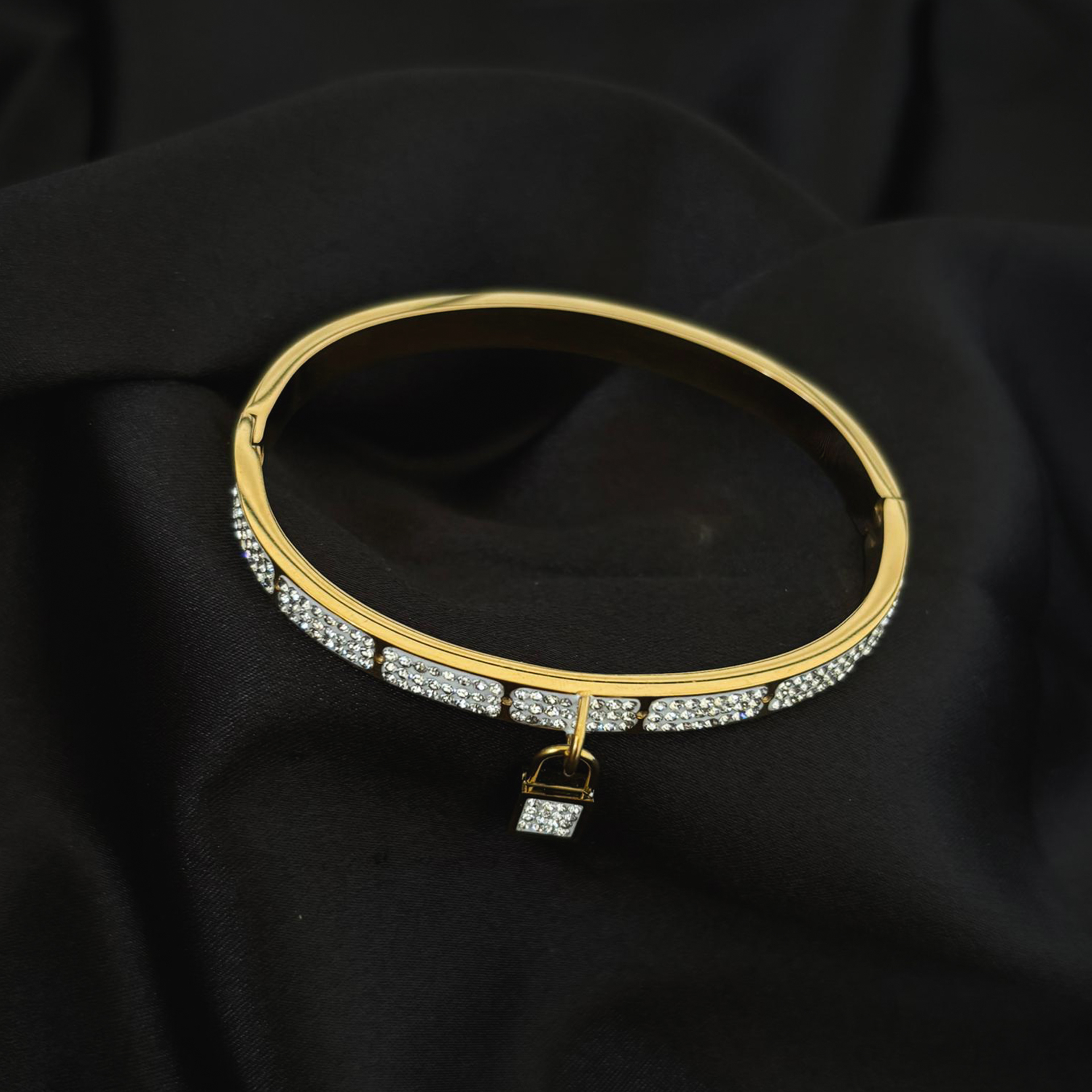 Le bracelet cerceau or contour diamants et médaillon Cadenas diamant en acier inoxydable est une pièce unique qui mêle éclat et symbolisme.