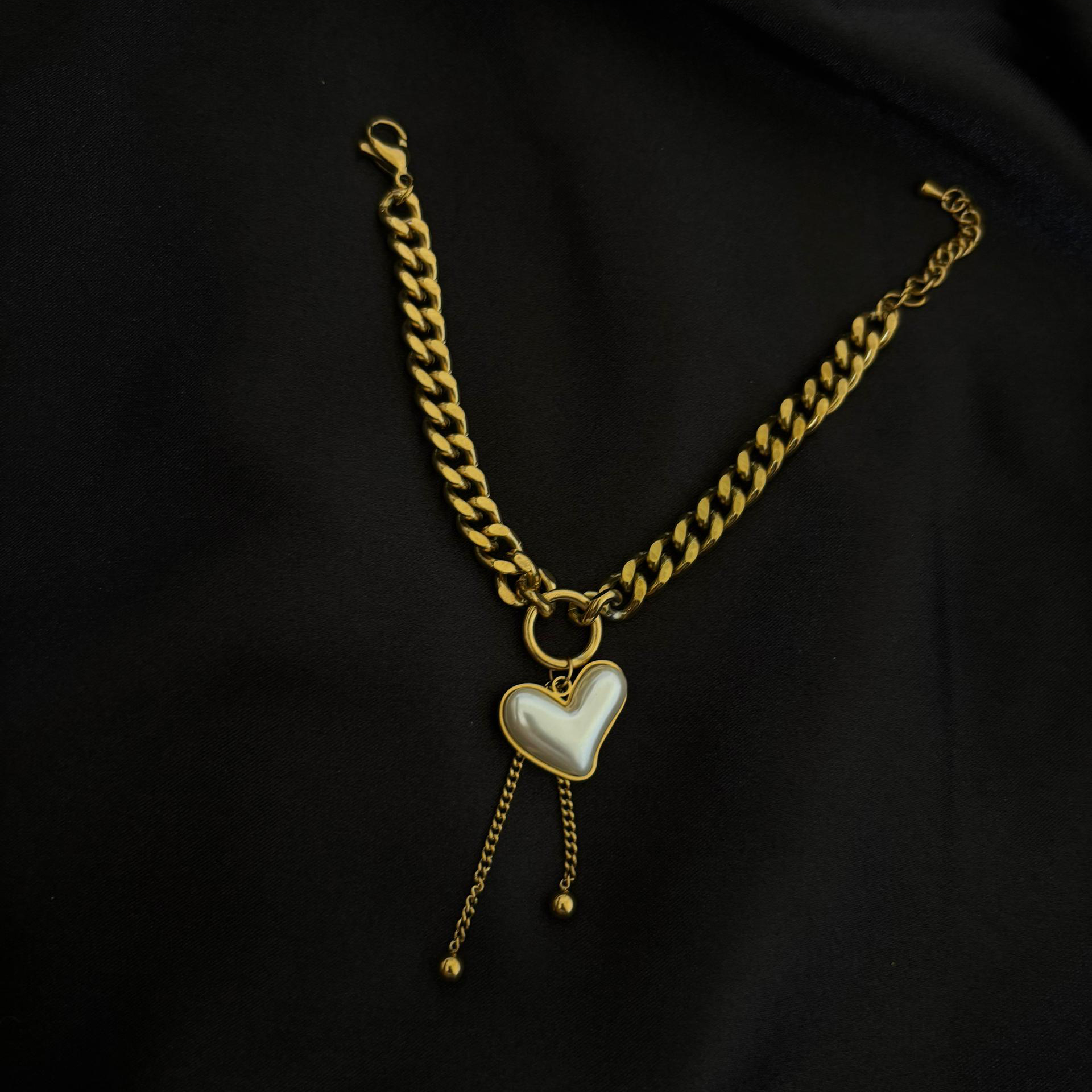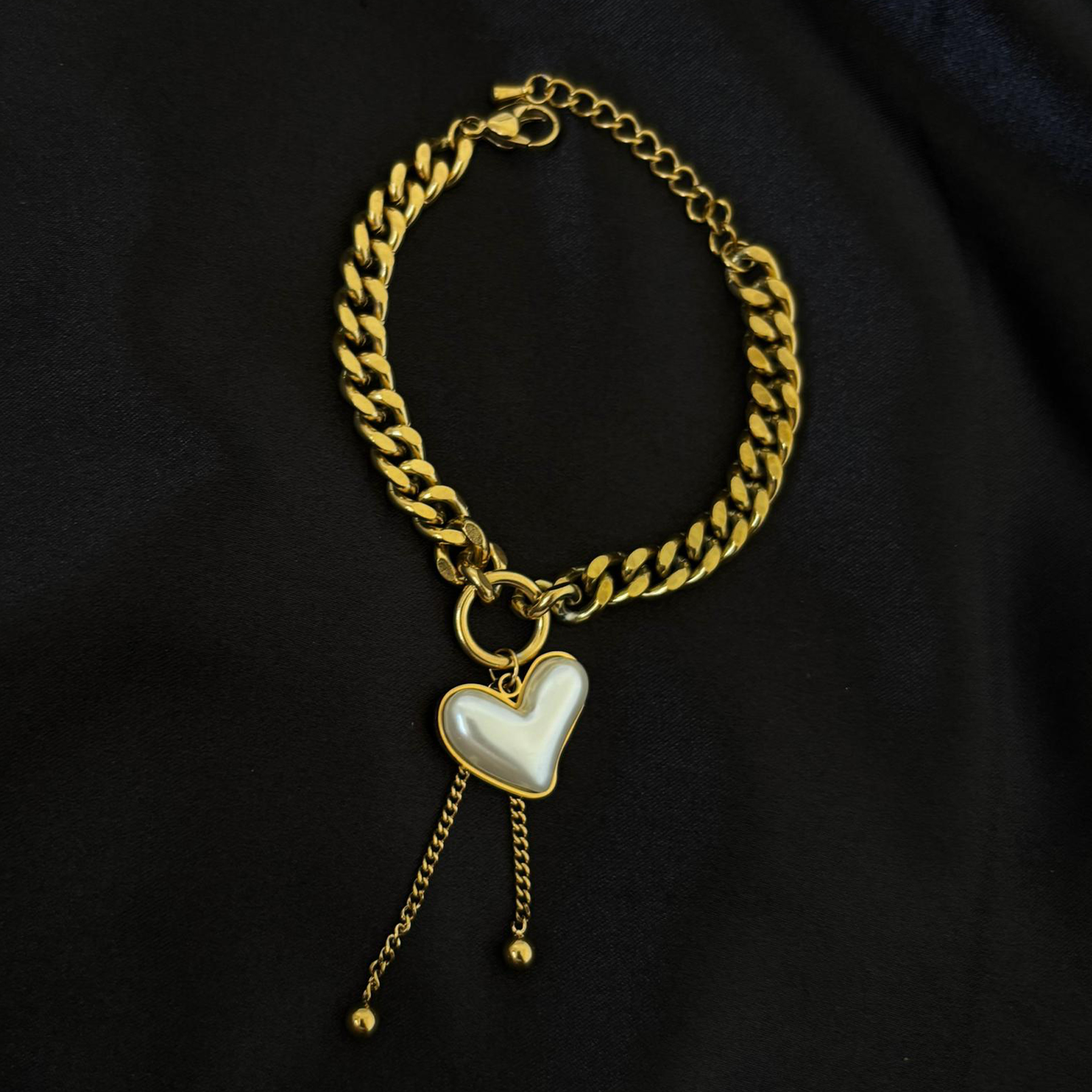 Un bracelet doré en acier inoxydable, orné d’un médaillon en forme de cœur, symbole d’élégance et d’amour intemporel.